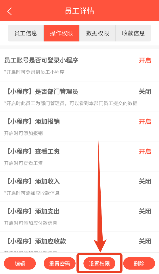 4、也可以设置员工的权限操作,点击下方第三个【设置权限】。