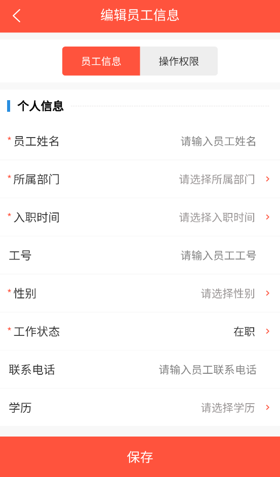5、你能开启或者关闭员工的一些小程序权限,或者再次修改员工信息,设置完成之后点击下方的保存就可以了。