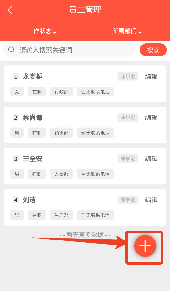 2、如果你想添加新的员工可以点击左下角的【+】号,填写员工详细信息点击保存就可以了。