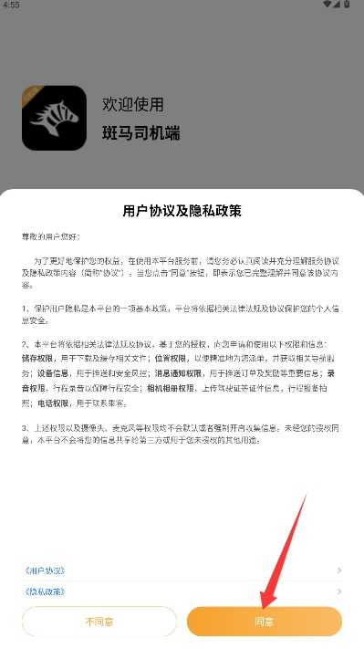 1、打开应用后仔细阅读用户协议和隐私政策,确认后点击同意按钮进入应用。