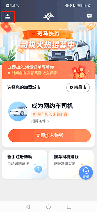 1、打开斑马司机端,点击左上角按钮进入个人页面。