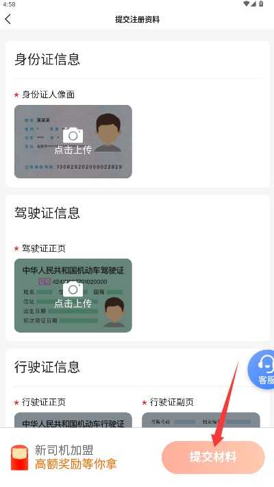 4、按要求上传身份证、驾驶证和行驶证等证件信息,提交资料等待平台审核。