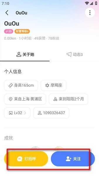 点击某个用户,就可以进入查看简单的信息,如果想认识,就点击“打招呼”或者“关注”;