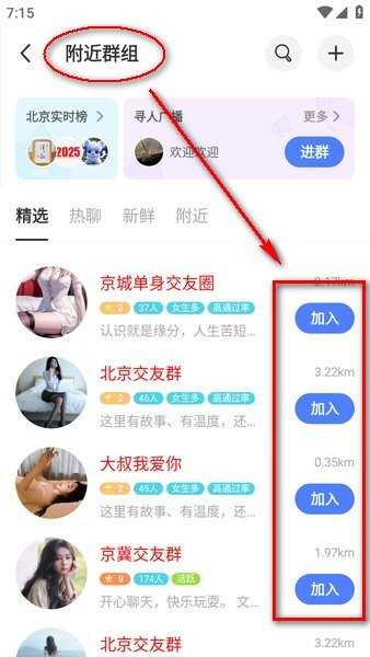 点击“我的群组”,可以查看“附近群组”,进交友群,能帮你发现不少约会对象;