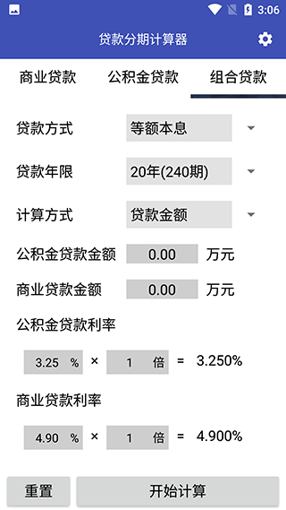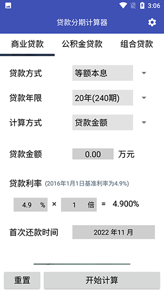 1、打开软件,选择商业贷款,填写好对应的信息后点击开始计算。