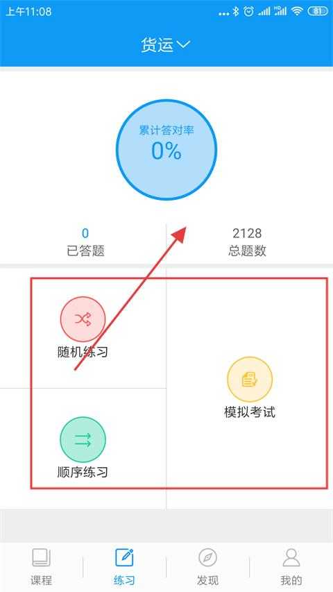 1、继续教育APP货运练习页,显示累计答对率、已答题数等数据,提供随机练习、模拟考试、顺序练习功能,助力货运驾照继续教育刷题备考。