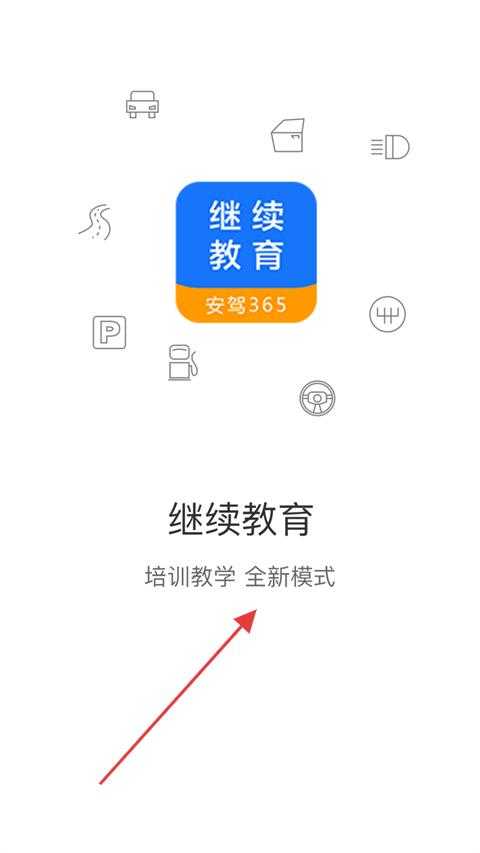 3、APP启动页,展示继续教育安驾365标识及培训教学,全新模式理念,直观呈现软件定位与特色,引导进入学习。