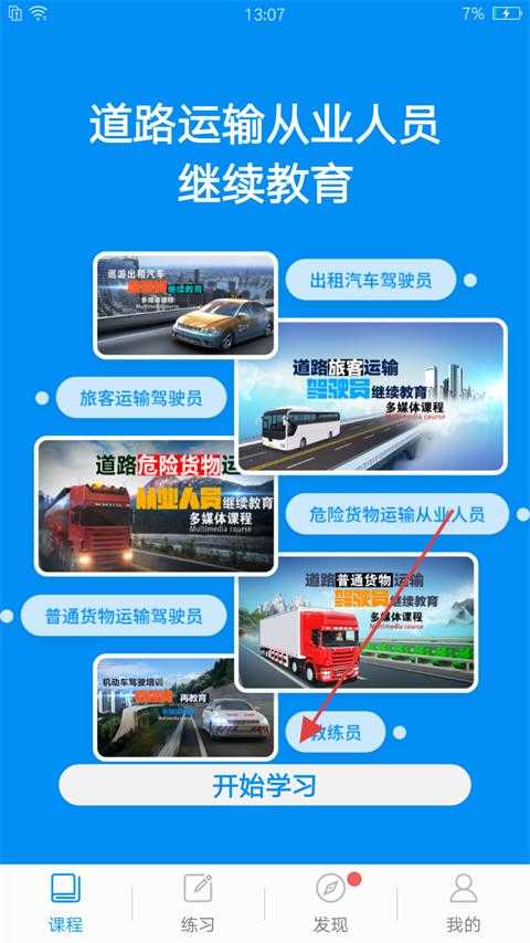 2、课程选择页,罗列道路运输从业人员多类别继续教育课程如出租、客运等,选对应课程点开始学习,开启专业知识学习。