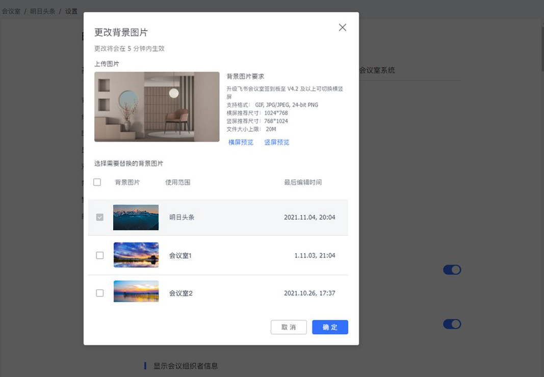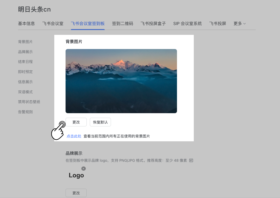1、管理员可以对飞书会议室签到板在空闲时段展示的背景图片进行设置。