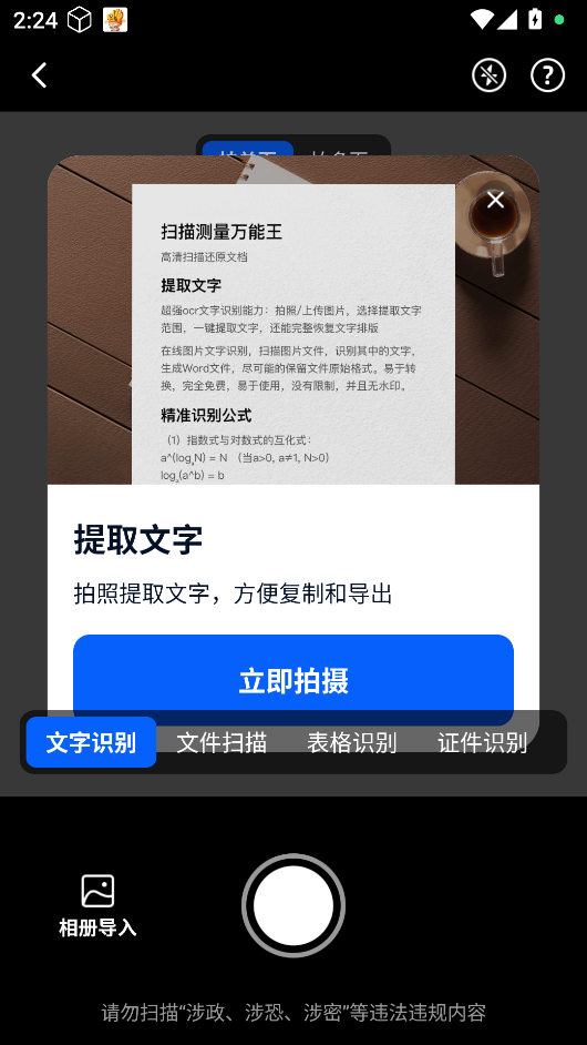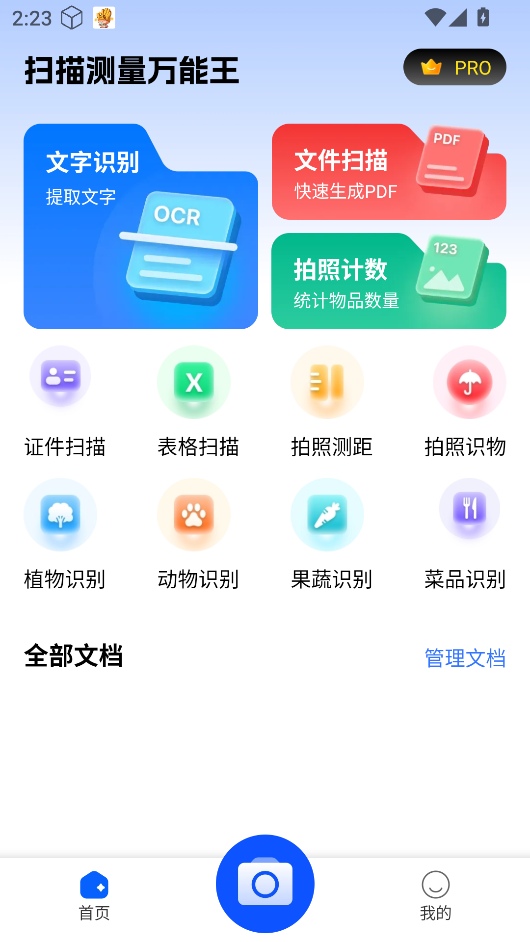 扫描测量万能王是一款集扫描文件、文字自动识别、拍照计数、实时测距等功能的一键使用高效处理软件,帮忙你处理日常生活中快速计数、实时测量、文件处理等诸多费时耗力场景,让你的生活更加便捷化。为用户提供专业的扫描功能,包括文件扫描、证件扫描、文字扫描提取等,实现多功能扫描和精准提取文字内容,支持快捷复制导出,方便办公学习。软件还支持拍照计数和测距,适用于多种场景。