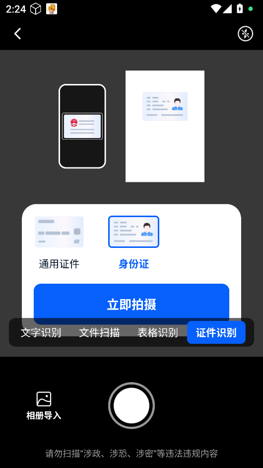 3、点击证件扫描即可对准证件扫描形成文件保存,也可以相册导入。