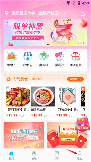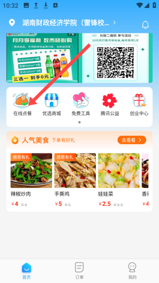 1、首页定位湖南财政经济学院,集成在线点餐、优选商城等服务,展示人气美食特惠,广告区推数币福利,底部串联订单我的,助力学生便捷享校园生活。