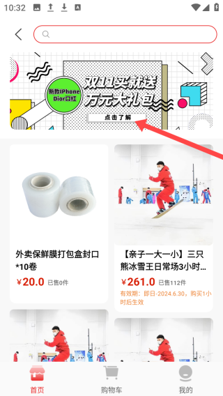 2、优选商城页推双11买赠活动,陈列外卖保鲜膜、亲子冰雪场等商品,标注价格销量及有效期,底部设购物车入口,满足学生日常购物需求。