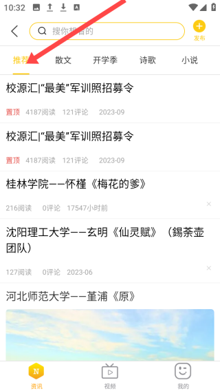 3、最新版资讯页设推荐散文等栏目,置顶军训照招募令,罗列桂林学院等校文学作品,显示阅读评论数据,支持内容发布,搭建校园文化交流阵地。