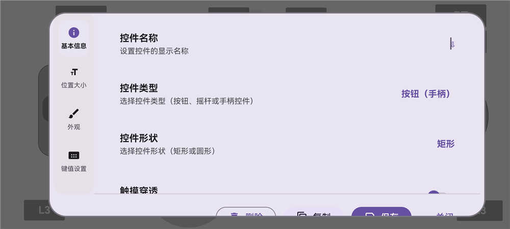 7、不论是键盘模式还是手柄模式,进入后点击控件都能单独进行设置,这里以手柄模式为例。单点任何控位都能进行详细的设置,比如名称、类型、形状、大小、透明度等等,还能点击下方进行删除和复制。机型不同软件内某些部分可能会显示不完全,但不影响使用。