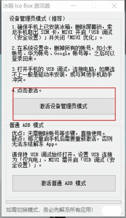 4、然后冰箱App并打开选到设备管理员模式,并点击下载一键激活工具