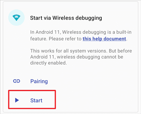 通过无线调试启动适用于Android 11或以上版本。这种启动方式无需连接电脑。由于系统限制,每次重新启动后都需要再次进行启动步骤。