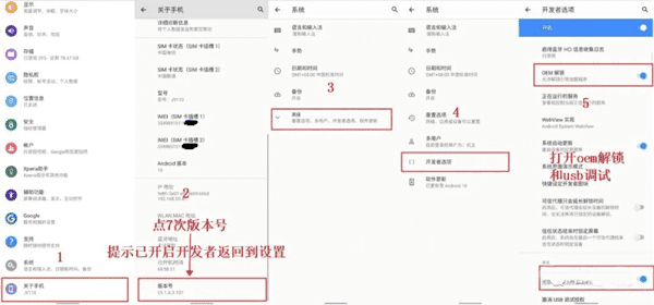 2、打开手机的USB调试模式(不会操作的看图,OEM解锁不用打开)