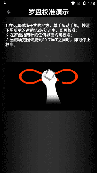 1、在远离磁场干扰的地方,单手挥动手机,按照下图所示的运动轨迹花“8"字,即可校准;