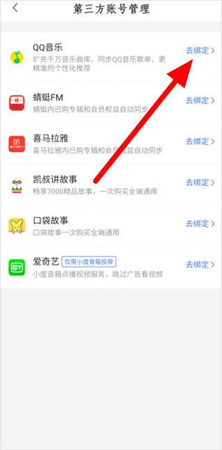 3、进入第三方账号管理页面,点击QQ音乐右侧的去绑定;
