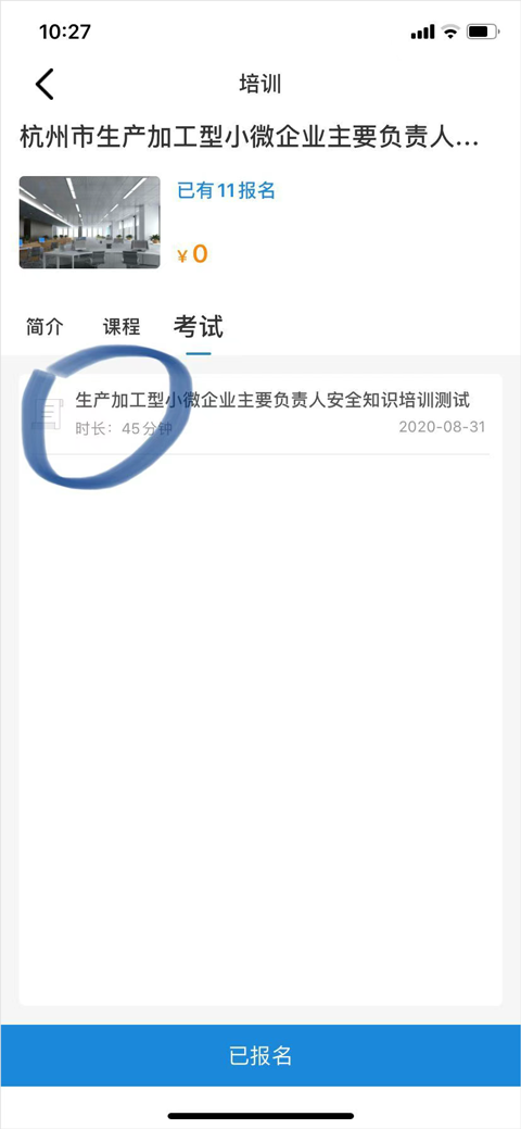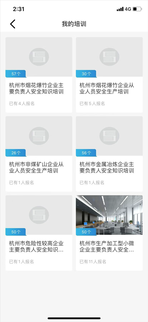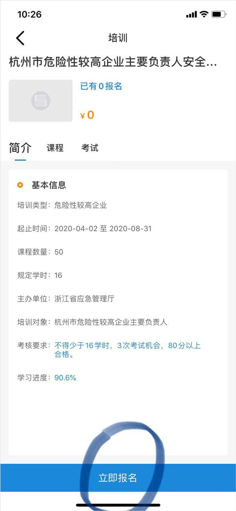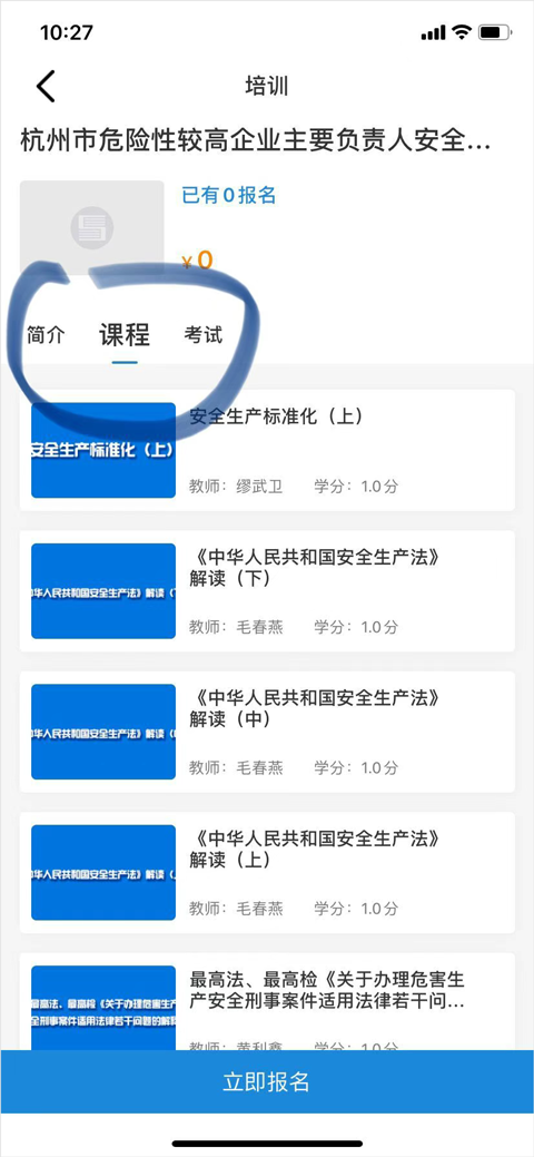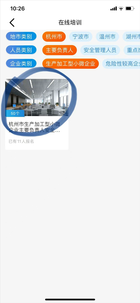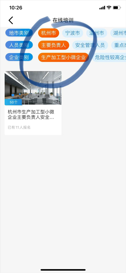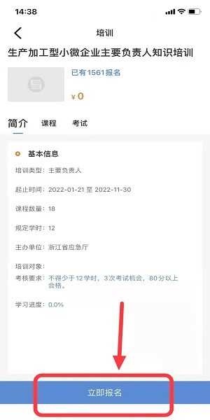 例如:杭州市-主要负责人-生产加工型小微企业,就可以看到杭州市生产加工型小微企业主要负责人培训,点击后进入相应培训,可以浏览基本培训信息、课程,当学用户满足规定学时情况下可以参与考试。