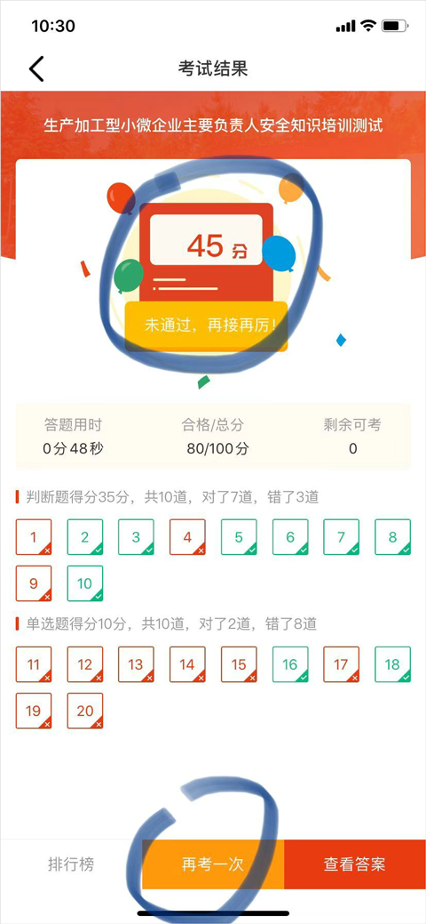 考试开始需要注意考试时间,当答题结束时点击提交需要进行一次人脸识别,识别过后即可看到考试分数及正确和错误答案。