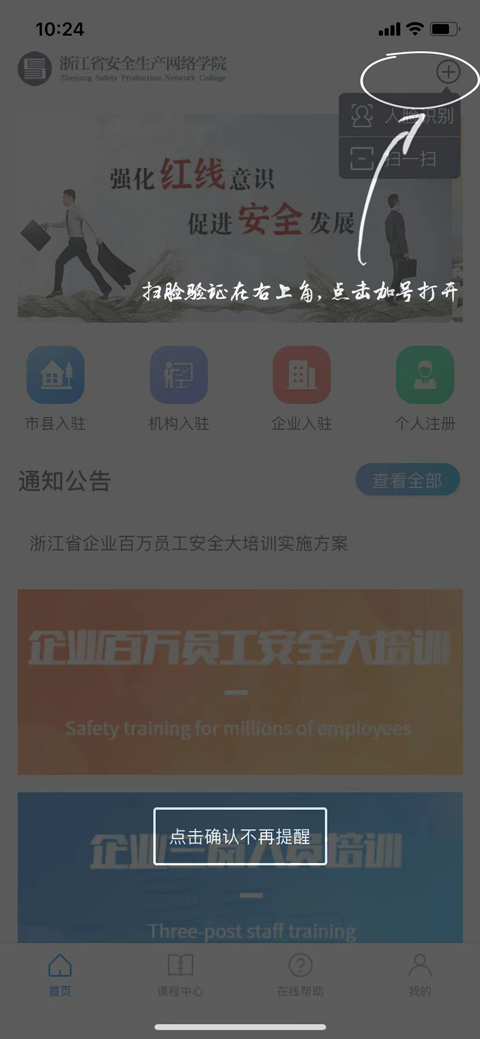 打开浙江省安全生产网络学院app后,在“首页”点击右上角的“个人注册”。