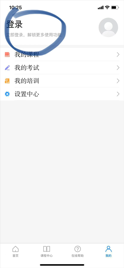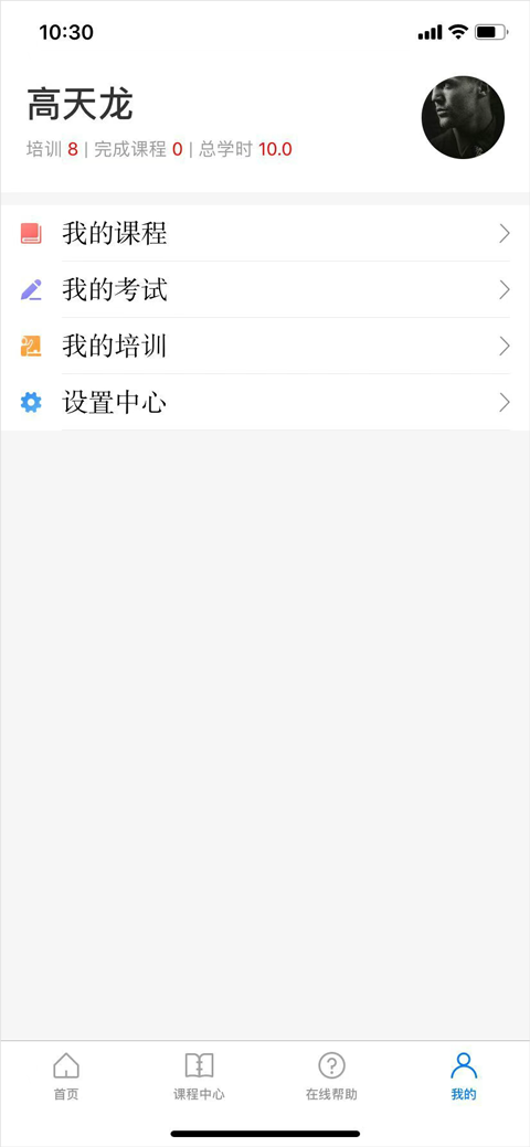 点击”我的”进入个人中心可以查看我所在的培训、我的考试、我的课程以及进行修改密码、修改个人信息等操作。