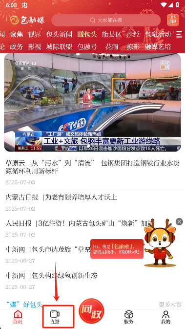 1、打开软件点击底部导航栏中的“直播”按钮,切换至直播频道