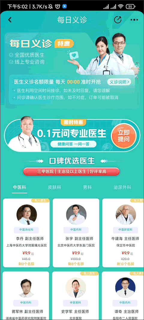 进入后我们根据自己的需求选择想要问诊的医生,这些医生都是三甲医院内任职的专家,给我们广大用户问诊的时间也是利用自己的空闲时间进行问诊,如果短时间没有回复那可能是医生正在工作中,请大家耐心等待;每天的义诊名额有限,每个人每天只能进行一次,大家注意时间抢订名额。