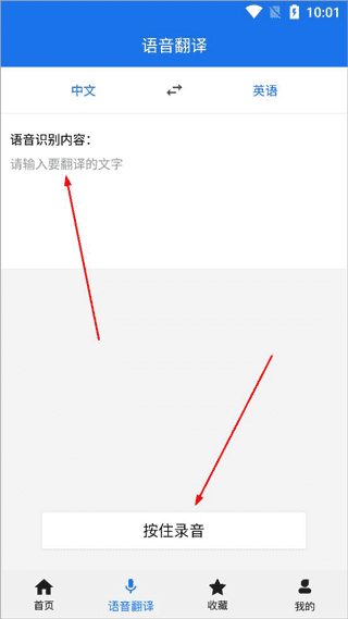 2、语音翻译版块,按住录音键录音即可识别语音内容;