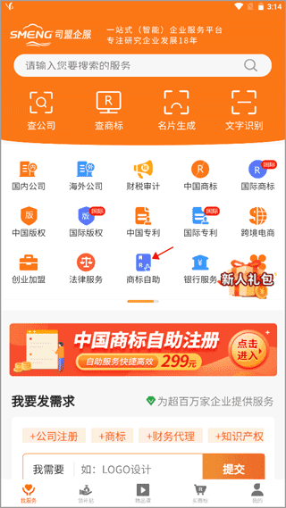 司盟企服商标注册是一个可以在线为企业用户提供企业公司注册、商标注册、资质办理、知识产权、财税服务、LOGO设计、评估服务、法律咨询等领域的2000多项专业服务的一站式智能企业服务平台。app为企业用户提供了多种的线上业务服务,通过将企业管理以及企业信息和公司商标等多种查询工具提供,可以在线查询企业用户所需要的各个信息,以及对公司的信息进行查询,针对需要进行合作的公司来进行查询。
