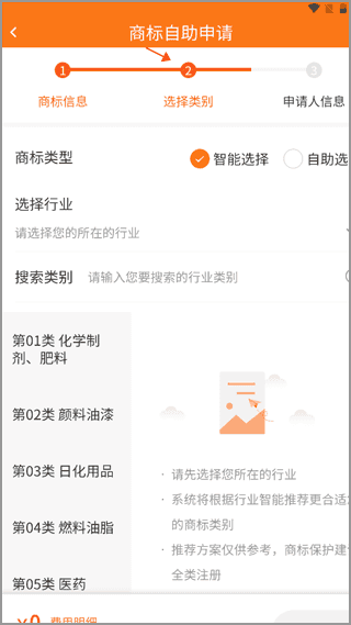 3、选择所在行业以及商标的类型,选好同样进入下一步。