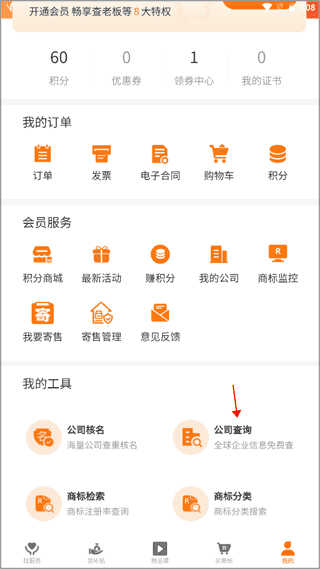 1、打开软件并进入到主页面,切换到【我的】界面,点击我的工具中“公司查询”。