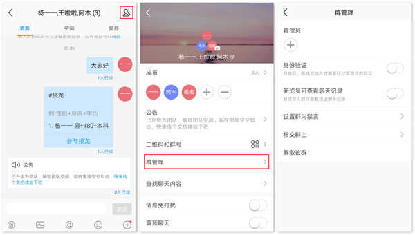 点击“群管理”,在群管理界面,可升级为团队、移交群主和解散群组。