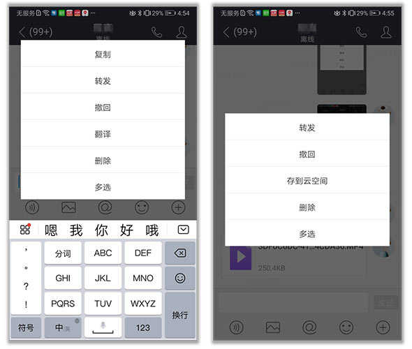 支持收发IM消息,文件,音视频等各种富媒体消息,在线播放音视频,还可随手拷贝,转发,撤回,删除,翻译文字消息,文件/音视频等消息还支持转存到云空间。