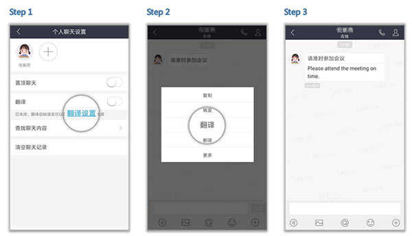 点击右上方的头像,设置好目标语言,长按消息即可翻译。