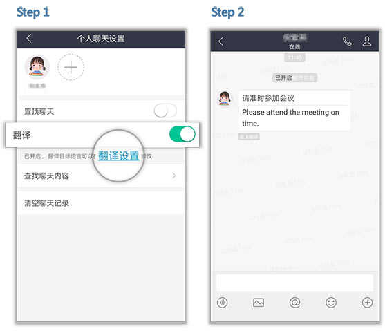 点击右上方的头像,开启翻译功能并设置好目标语言,即可实现实时翻译,沟通从此无边界!