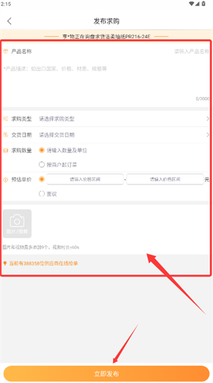 3、在发布求购界面填写产品详情与数量,点击发布即可完成操作。