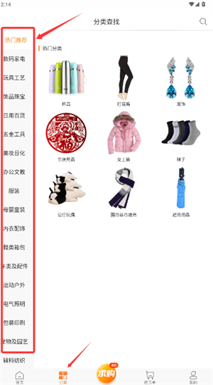 1、打开软件后,可以先从“分类查找”或“热门推荐”进入,比如找数码家电、日用百货等,直接点击就能浏览相关商品,这样找东西比较快。