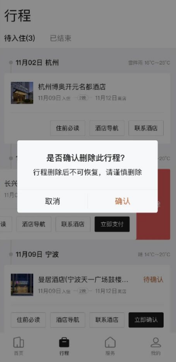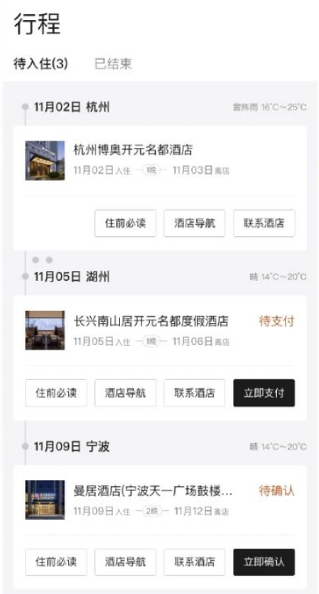 行程卡详细展示酒店名称、入离日期、酒店导航、电话等,入住更高效;阅读住前必读指南入住更安心。