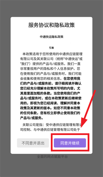 下载安装并打开中通掌上快运app,在服务协议和隐私政策提示界面点击同意并继续