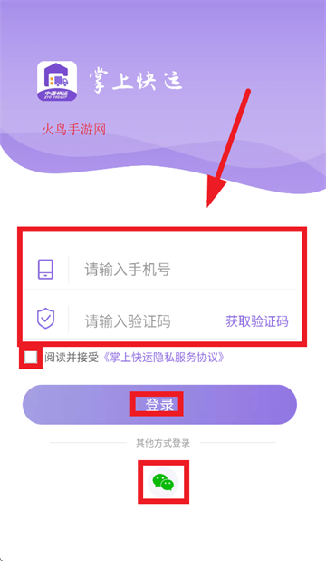 进入登录界面后,输入手机号,验证码,勾选阅读并接受 《掌上快运隐私服务协议》,点击登录即可,还可以使用微信授权登录