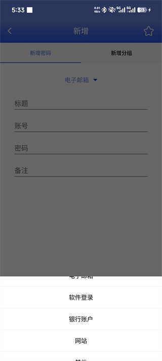 点击分类下拉框,可选择软件登录、银行账户、网站、其他等不同分类,适配各类账号记录。