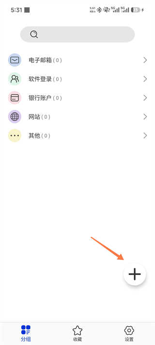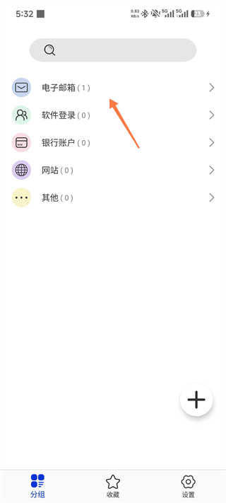展示电子邮箱、软件登录等五大分类,点击右下角+号可进入新增密码/分组界面。