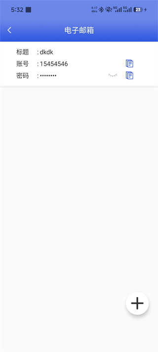 展示已收藏的信息,密码默认隐藏,支持复制账号/密码,可继续添加新记录。