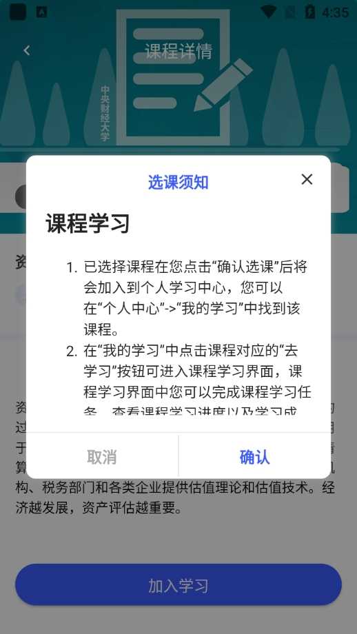 4、然后会出现选课须知,用户可以认真查看,注意:课程加入到学习中心后将无法取消;