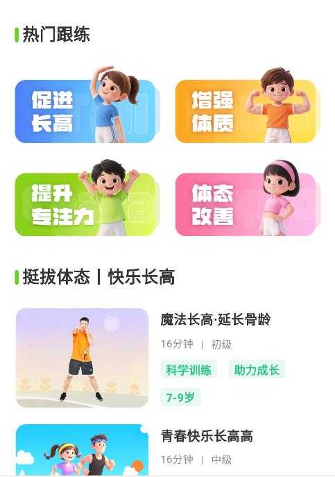 小树苗运动是一款专为3-18岁儿童及青少年打造的智能运动健康管理平台,它依托国家体育总局青少司权威指导与专业儿科运动研究,通过AI智能评估生成个性化运动方案,涵盖趣味长高操和亲子互动课程等20余种居家可练项目,平台采用真人教练示范与动画剧情引导双模式。许多的课程都可以找到,满足不同年轻段孩子的健康学习需求,以后学习各种健康课程就会非常的轻松了,绝对符合孩子的健康运动要求,助力孩子健康成长。