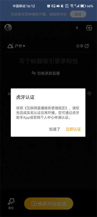 5、虎牙认证界面,只有认证成功之后才可以进行直播,点击立即认证,然后在此界面绑定手机号;