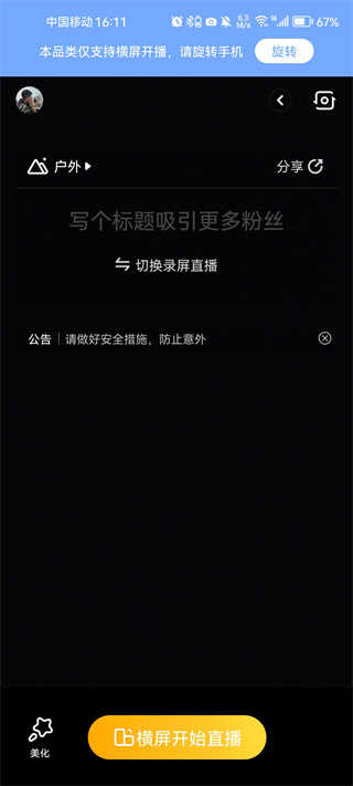 3、跳转此界面后进行编辑直播间内容,可以撰写标题以及开启美颜等等,完成后点击横屏开始直播;